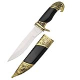 - El pomo es una cabeza de águila de color bronce del mismo color que la guarda, la empuñadura es de color negro. El tamaño total es de 21cm con la hoja de acero. La vaina es de color negro con...