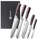 - JUEGO COMPLETO DE CUCHILLOS: Cinco cuchillos cocina ultra afilados para picar, rebanar, cortar y pelar y recortar con detalle. El set incluye 1 cuchillo chef, 1 cuchillo pan, 2 cuchillos santoku y 1...
